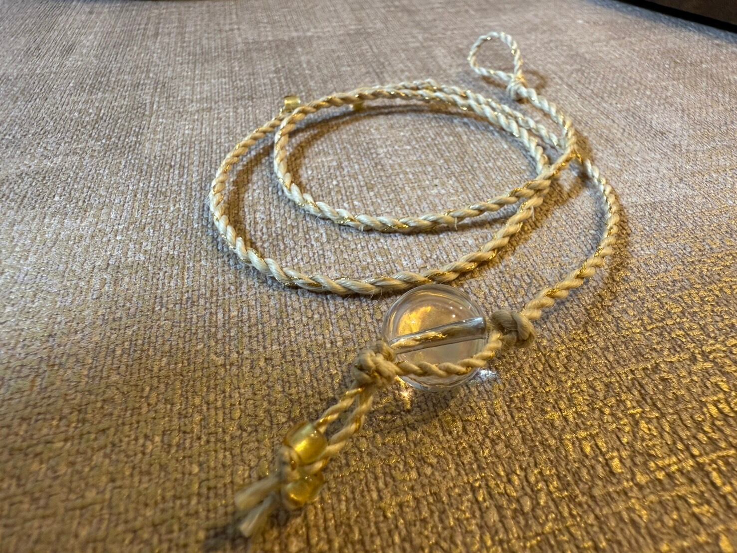 シンプルながらも美しいデザイン。 精麻に煌めく錦糸。留め具の水晶玉も心をクリアにしてくれます。