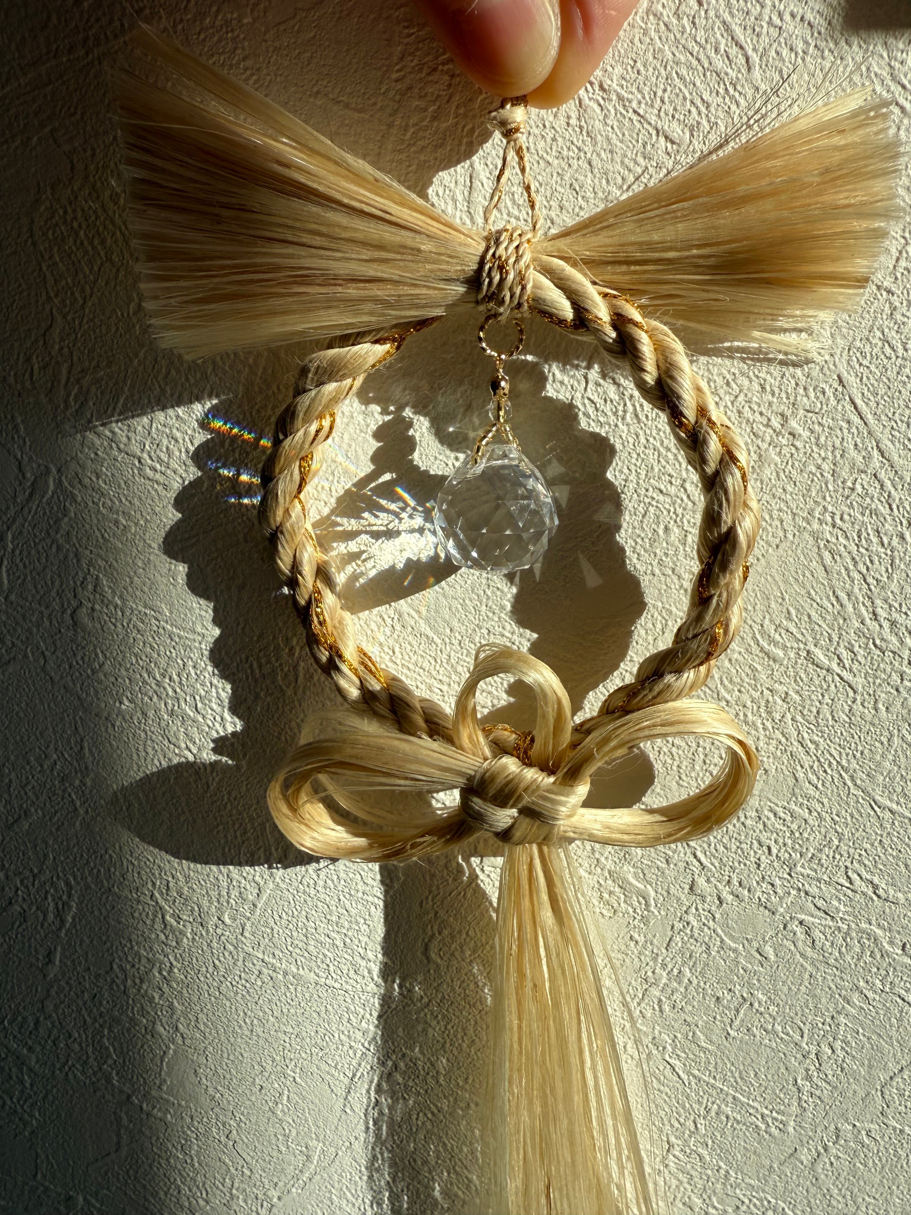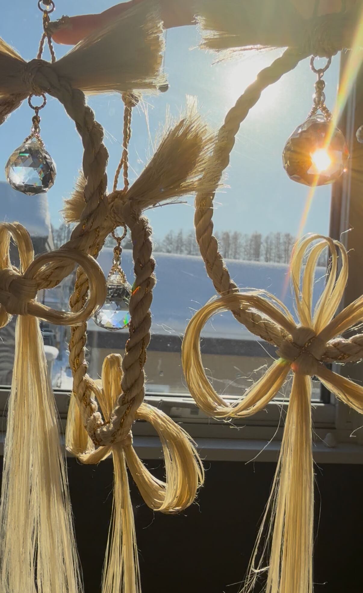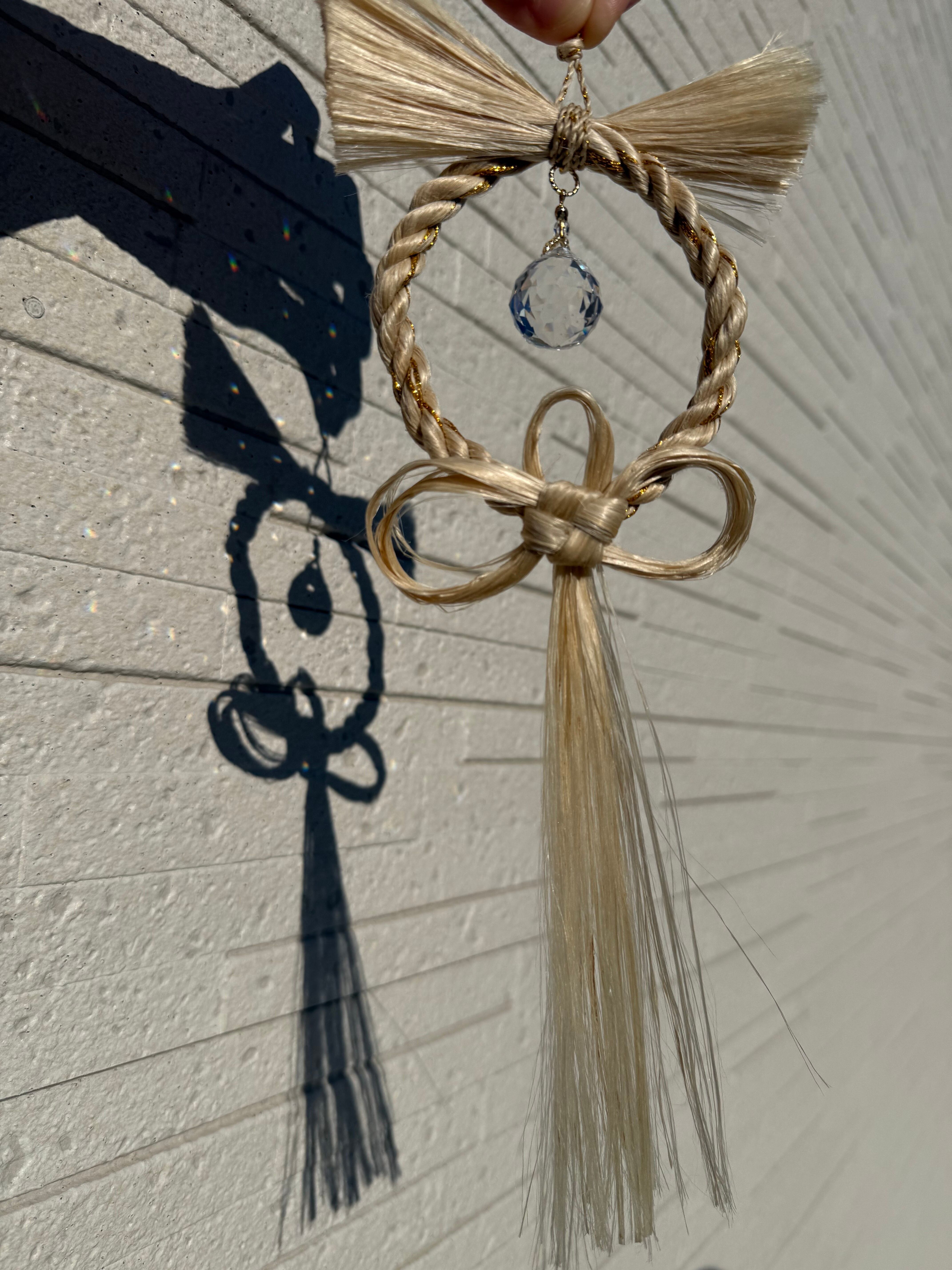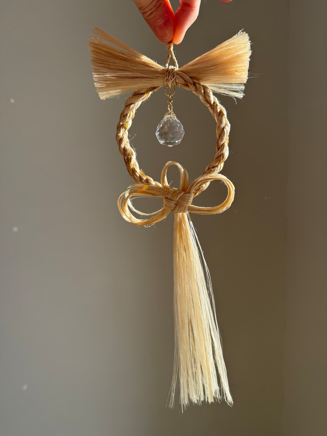 精麻のやわらかな光沢に、透明なサンキャッチャーの虹のひかり。