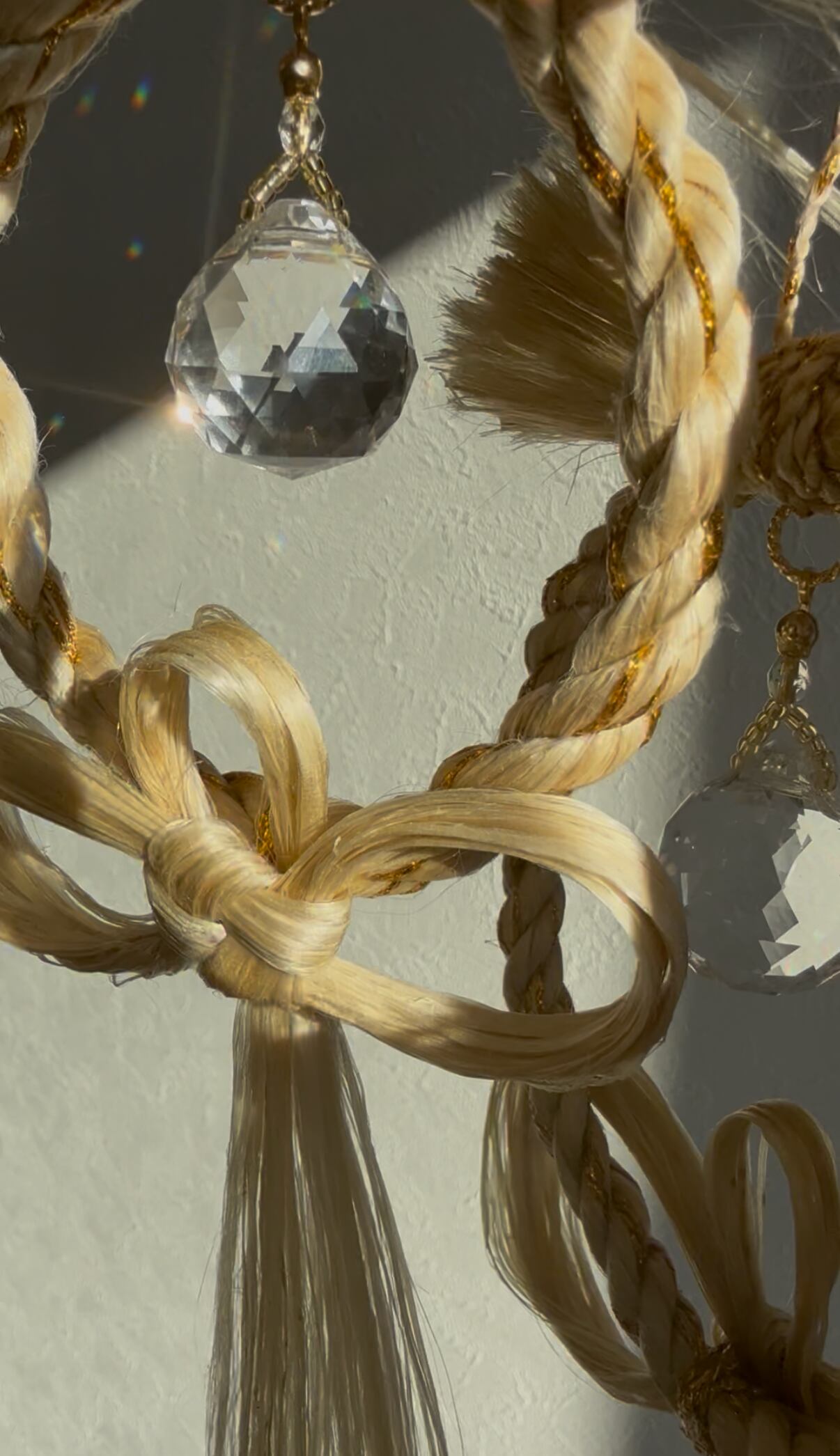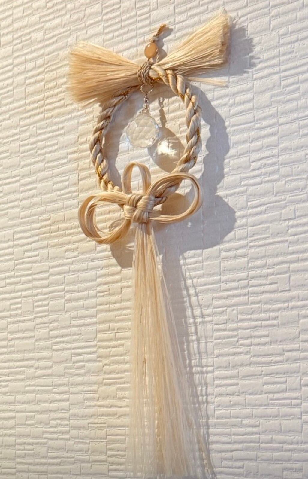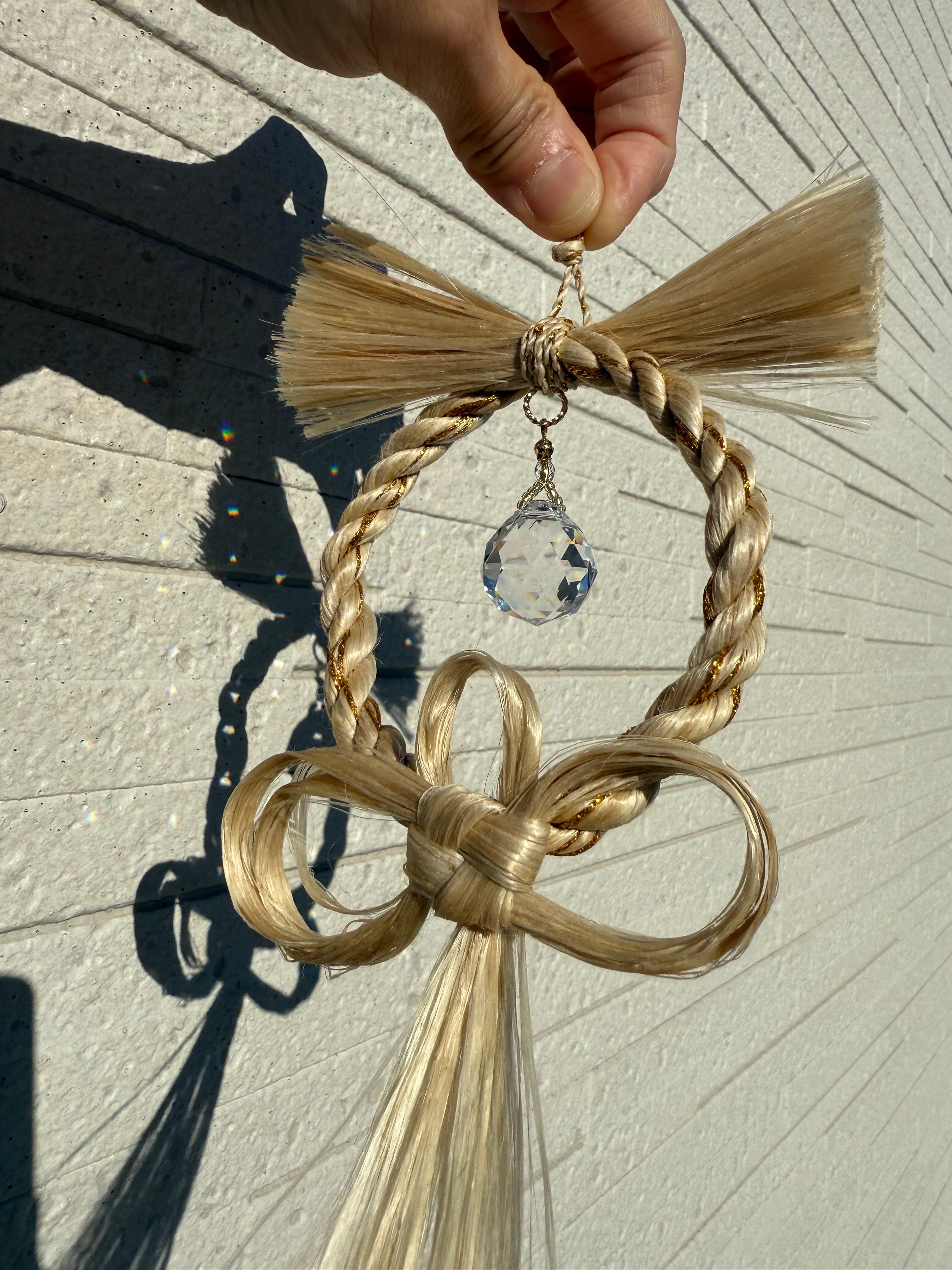 精麻のやわらかな光沢に、透明なサンキャッチャーの虹のひかり。