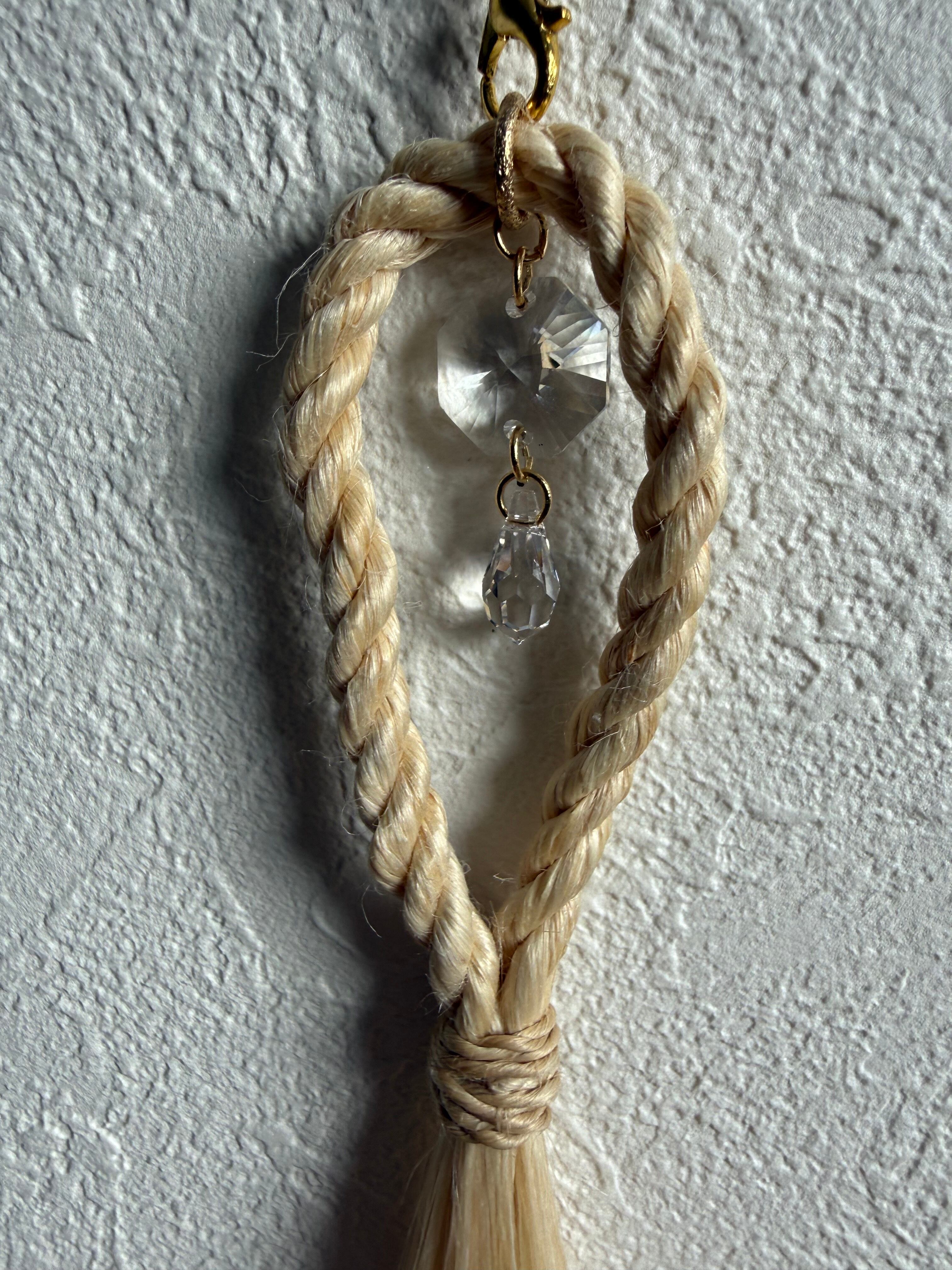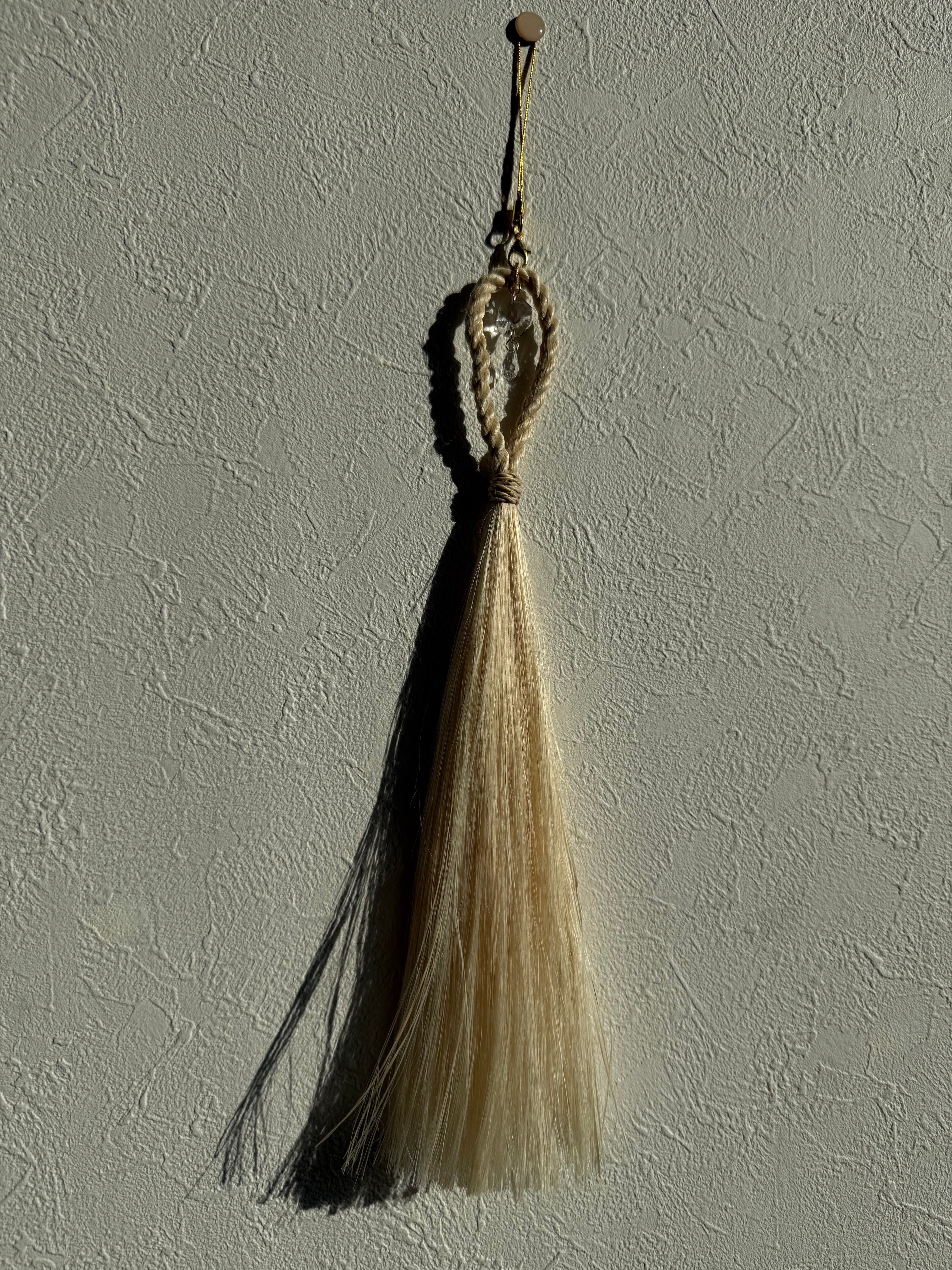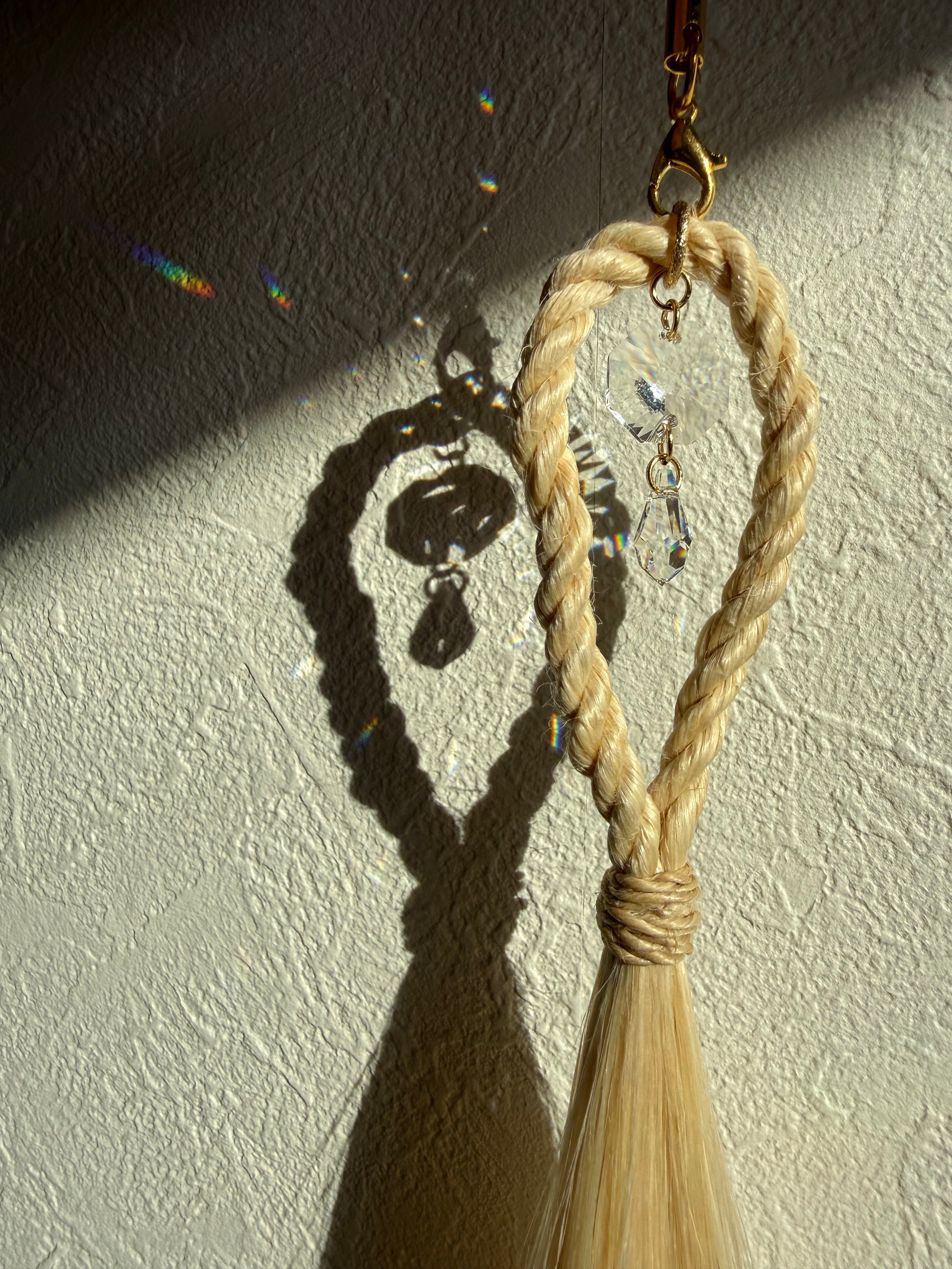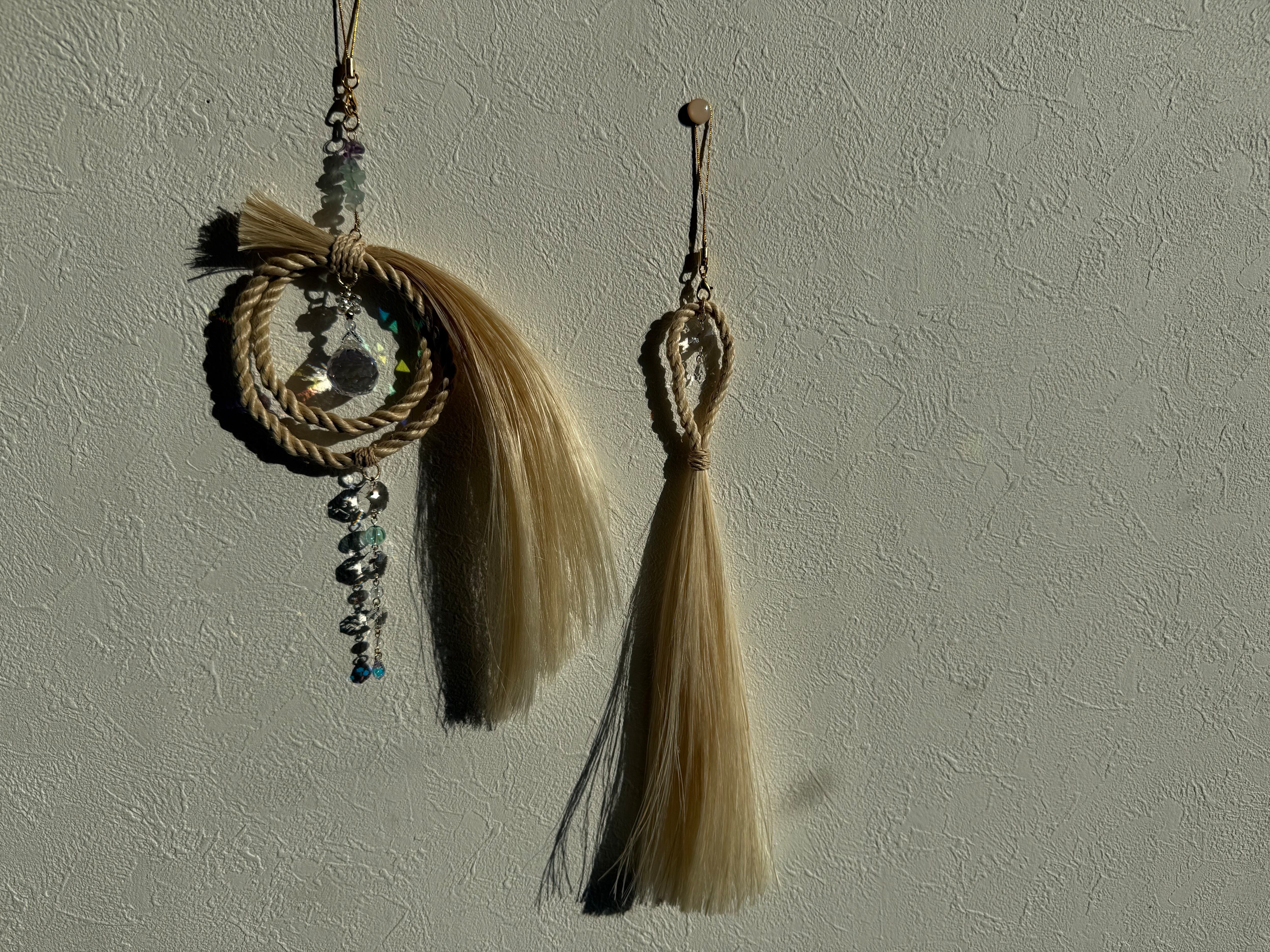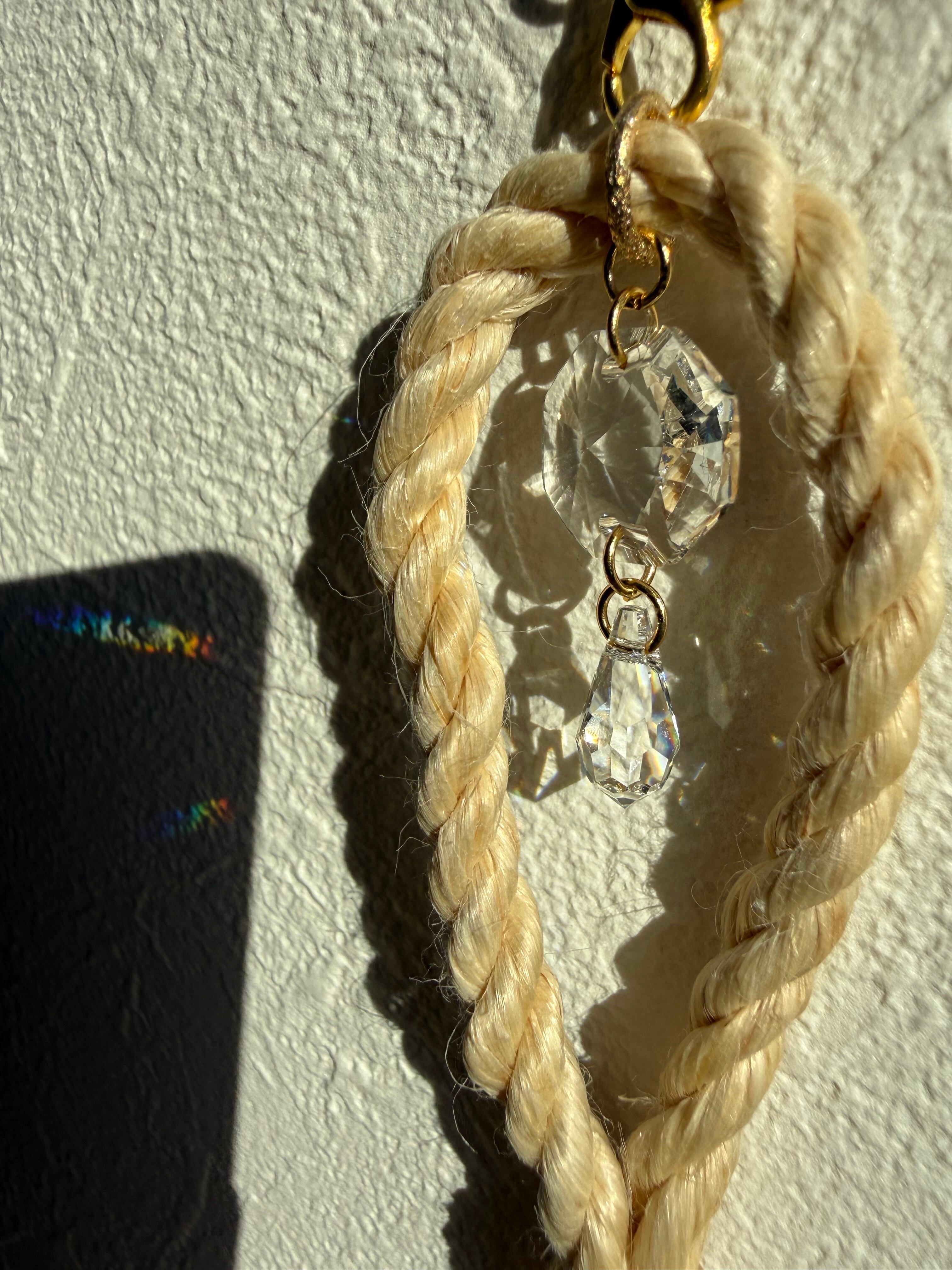 窓辺に吊るすと、太陽の光がクリスタルを通って虹の粒となり、空間をそっと祝福してくれます。“麻と光”が同時に揺れ、清らかさとあたたかさの両方が感じられる作品です。