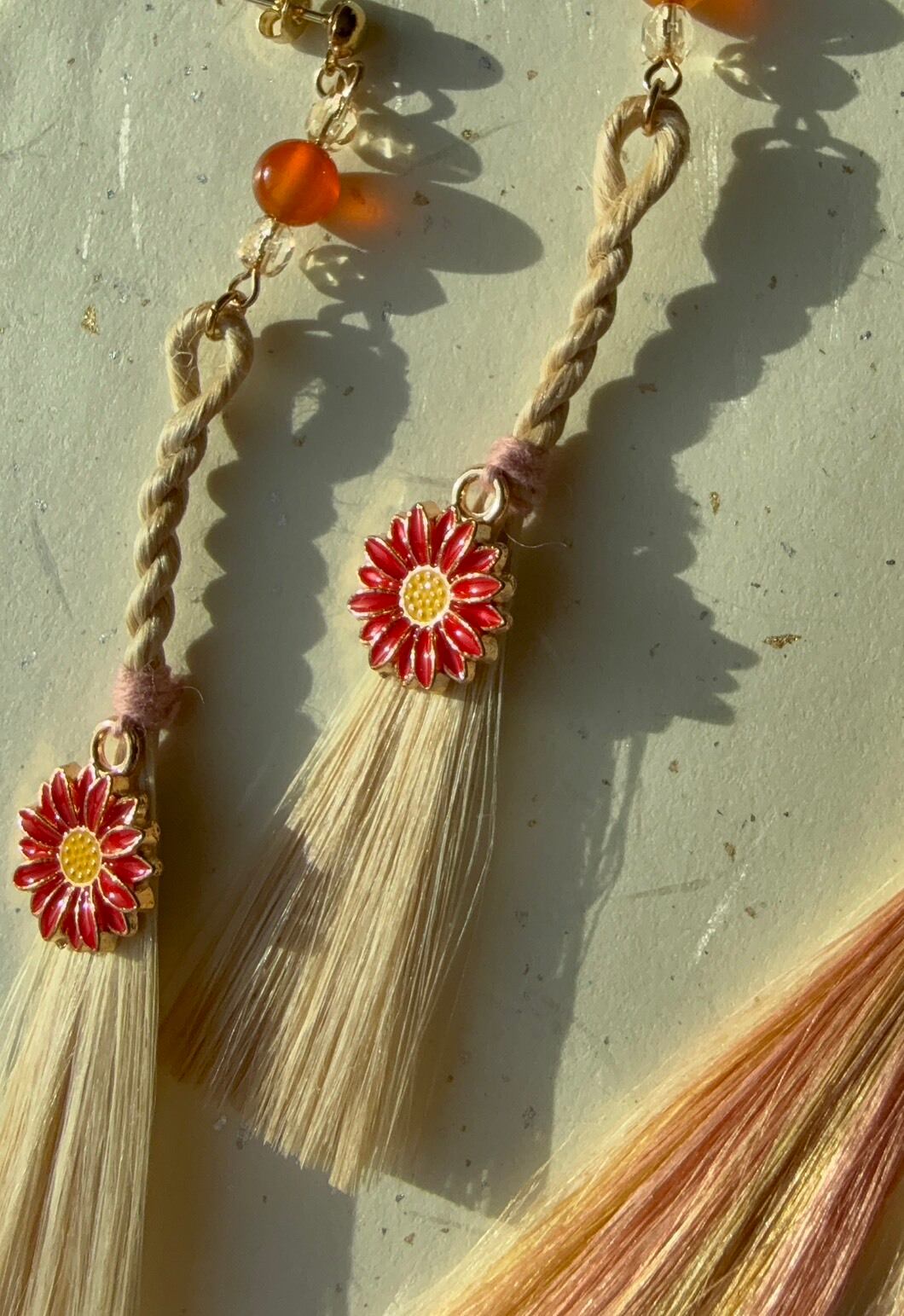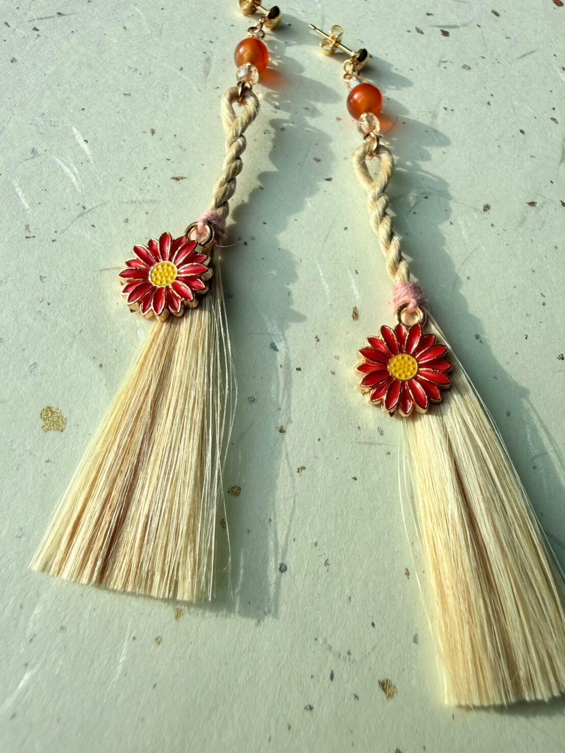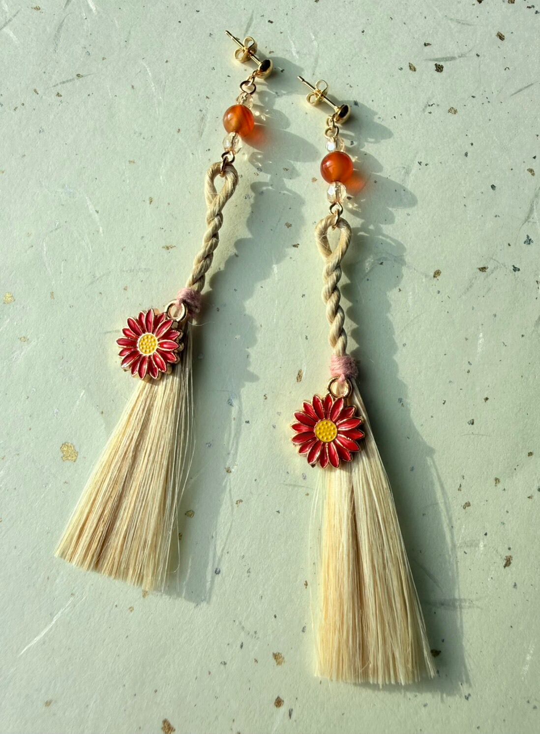 赤い花と精麻のタッセルをあわせた、晴れやかな耳飾りです。