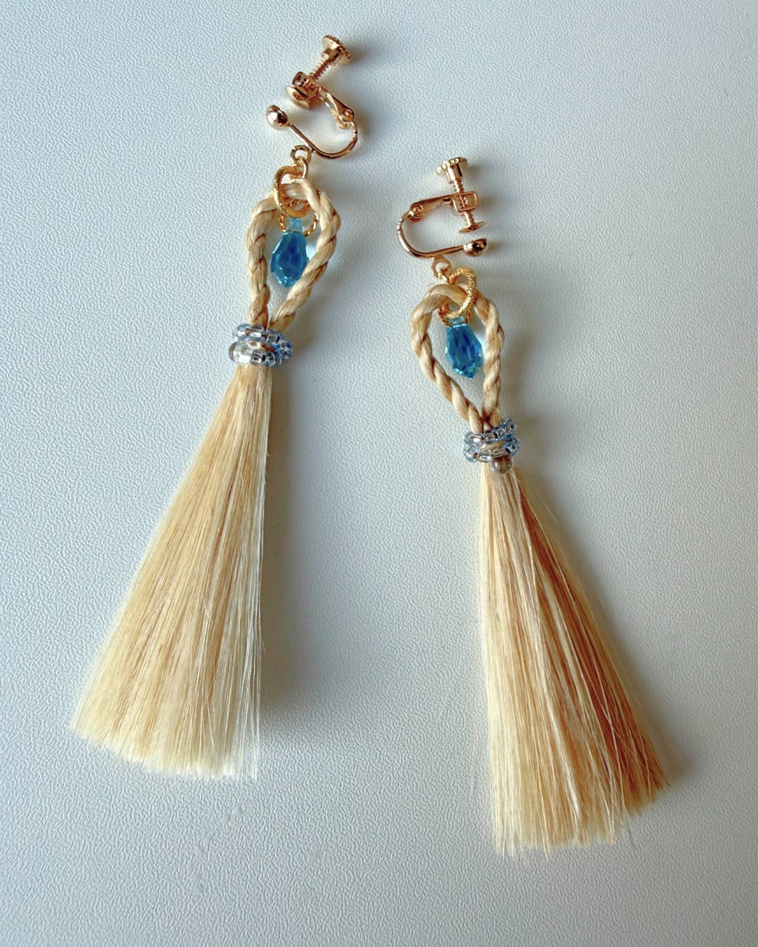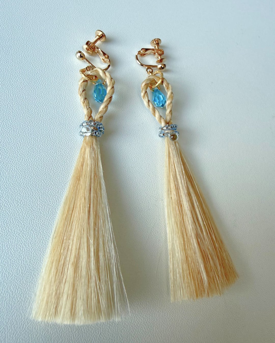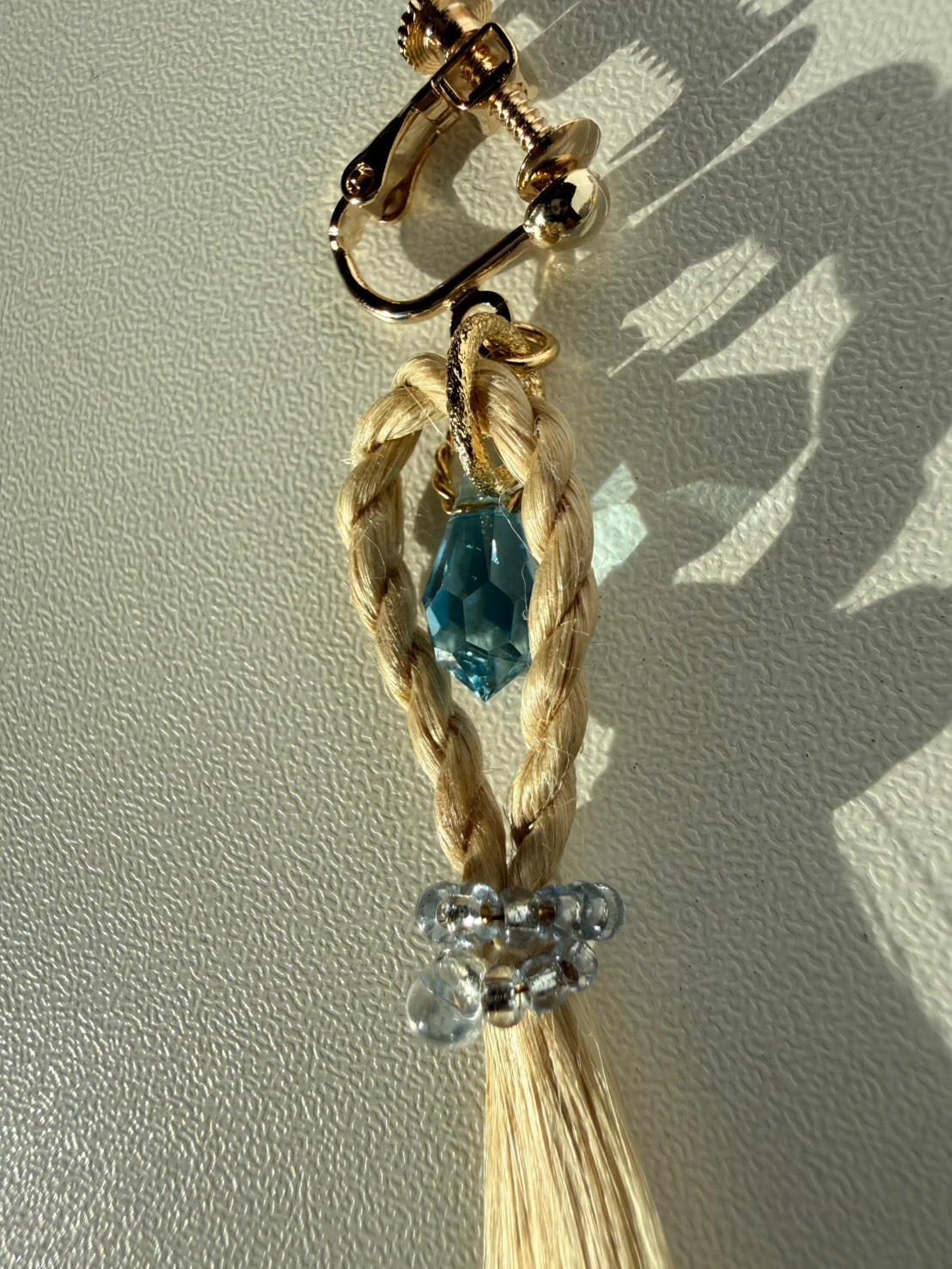 精麻のタッセルに、透明感のあるブルードロップを合わせた耳飾りです。光に透ける青は、水や空のように澄んだ色合いで、揺れるたびに爽やかな印象を添えてくれます。麻の房がふわりと揺れ、顔まわりに軽やかさが生まれます。