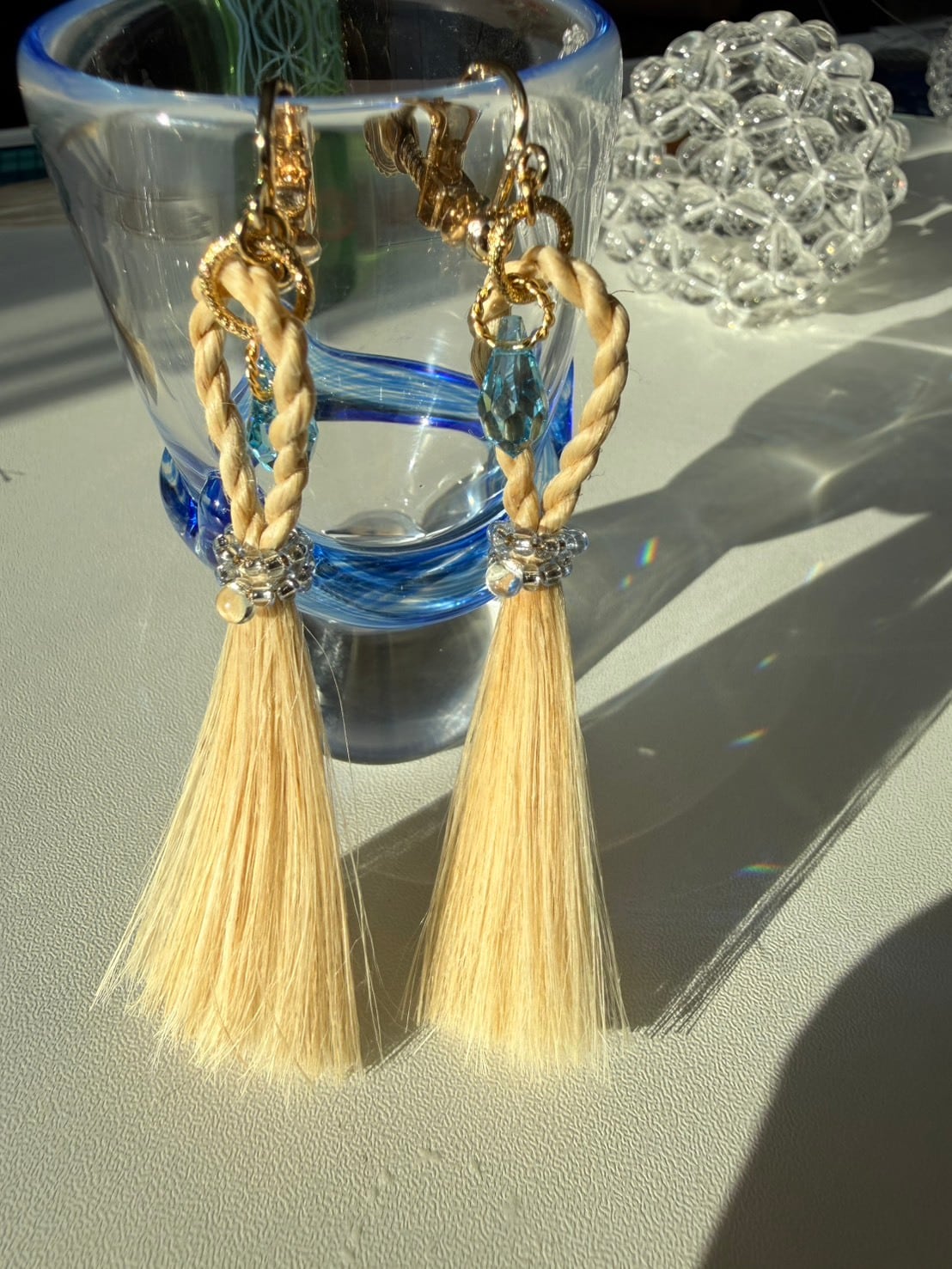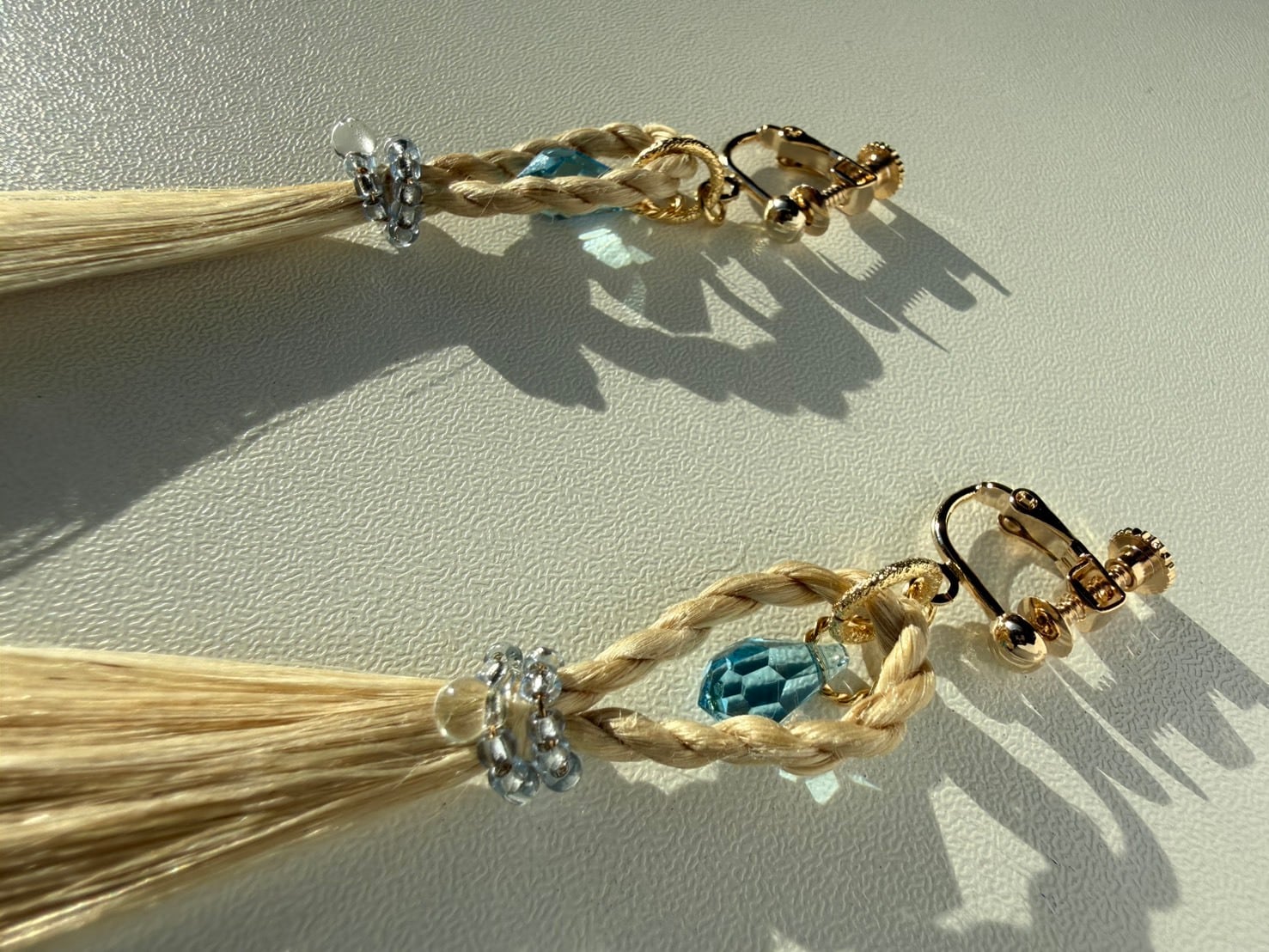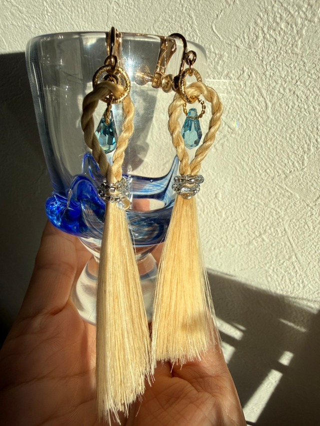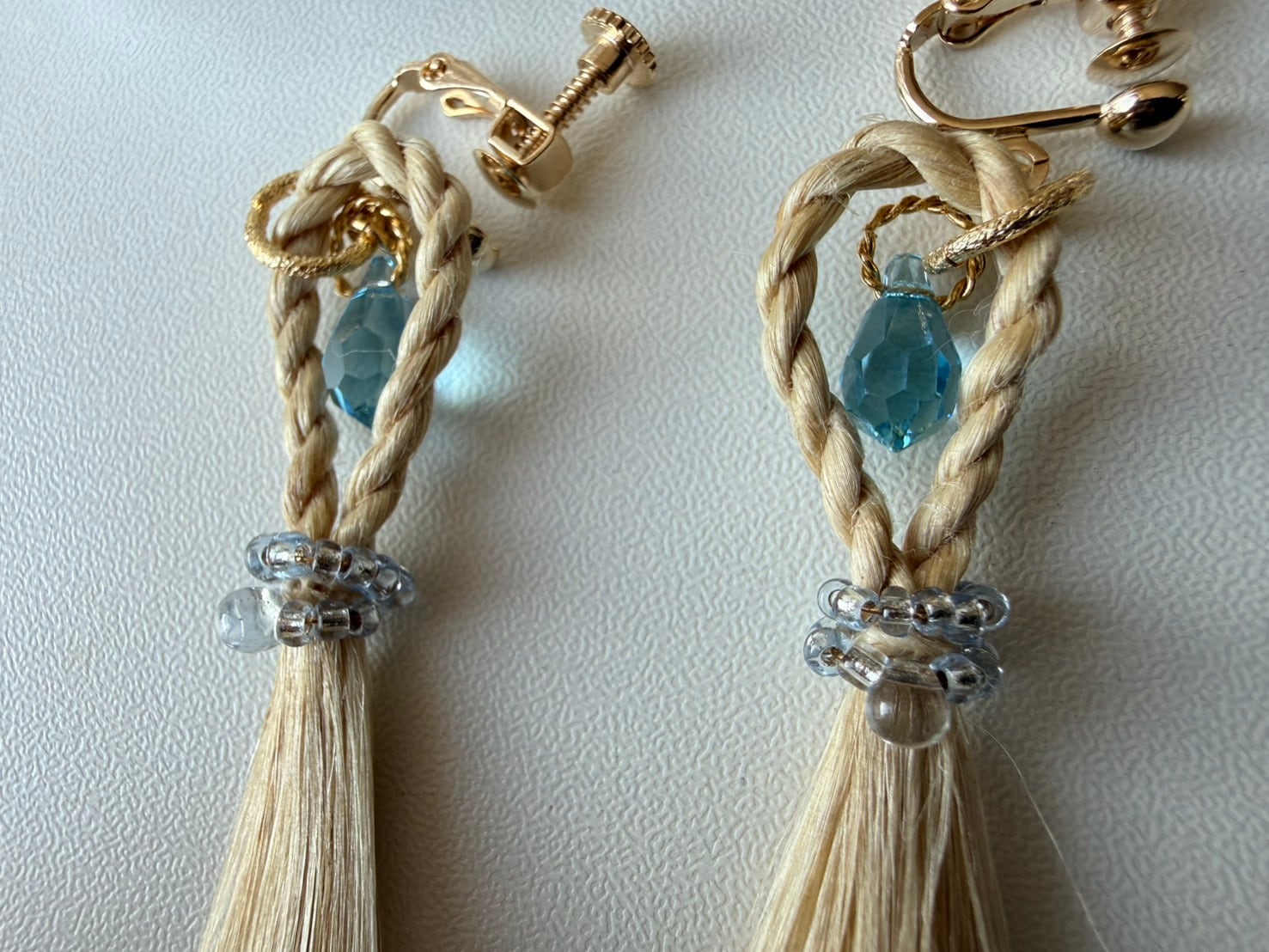 精麻のタッセルに、透明感のあるブルードロップを合わせた耳飾りです。光に透ける青は、水や空のように澄んだ色合いで、揺れるたびに爽やかな印象を添えてくれます。麻の房がふわりと揺れ、顔まわりに軽やかさが生まれます。