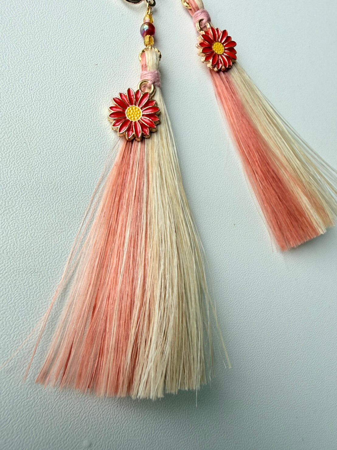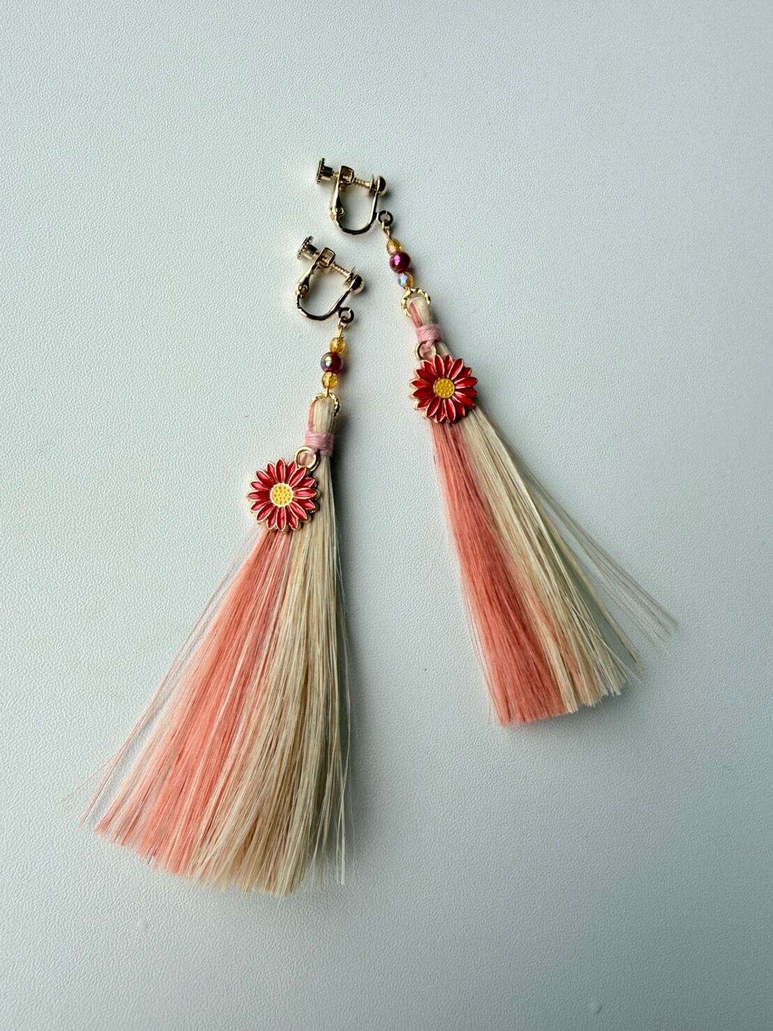 赤い花と茜染めの精麻のタッセルをあわせた、軽やかな耳飾りです。