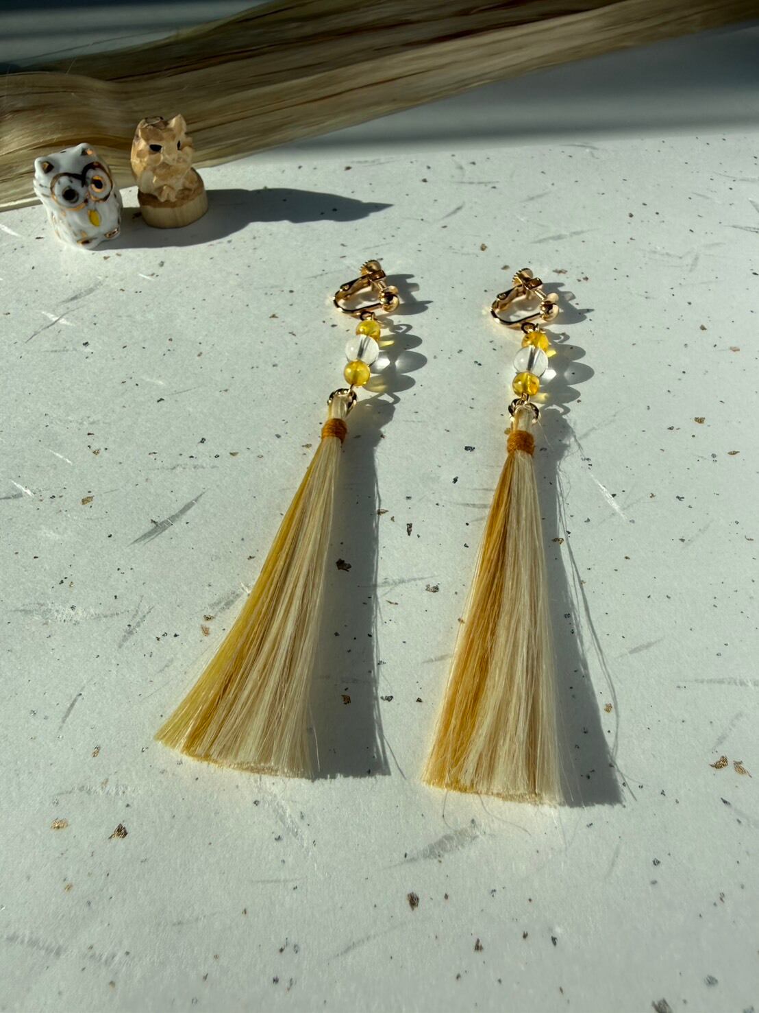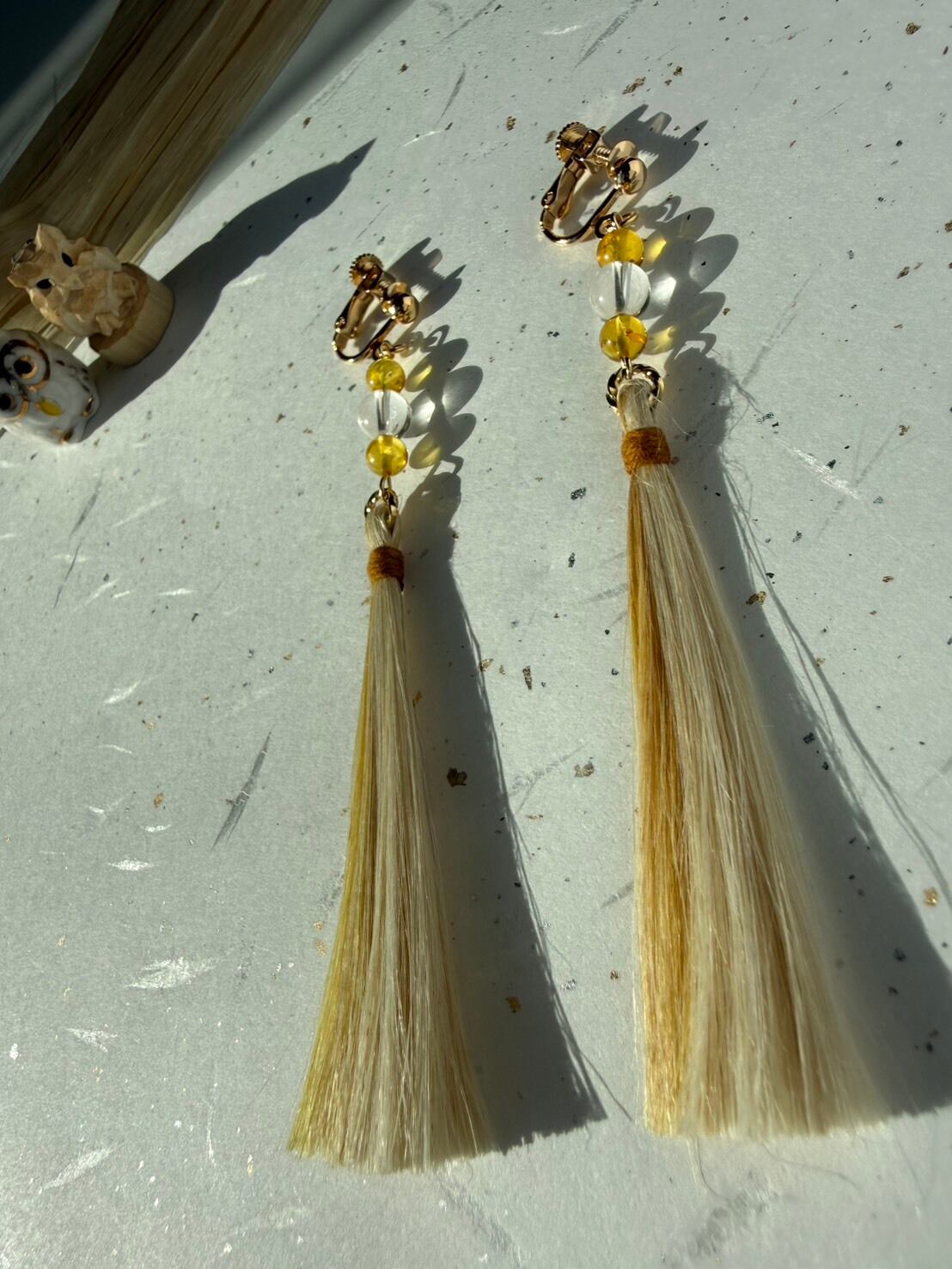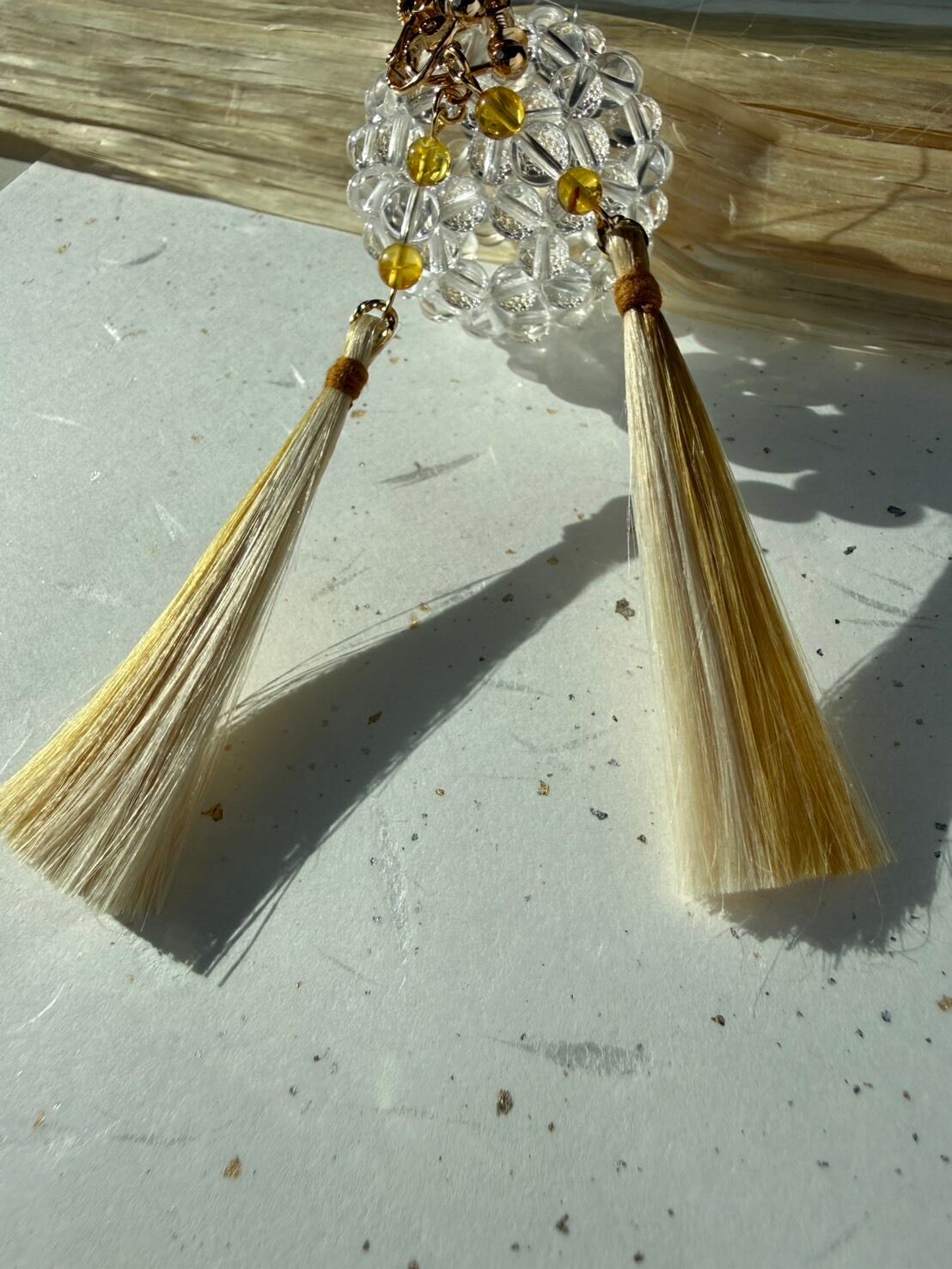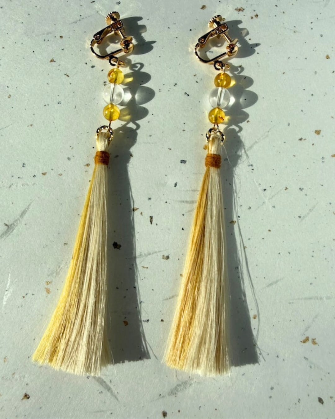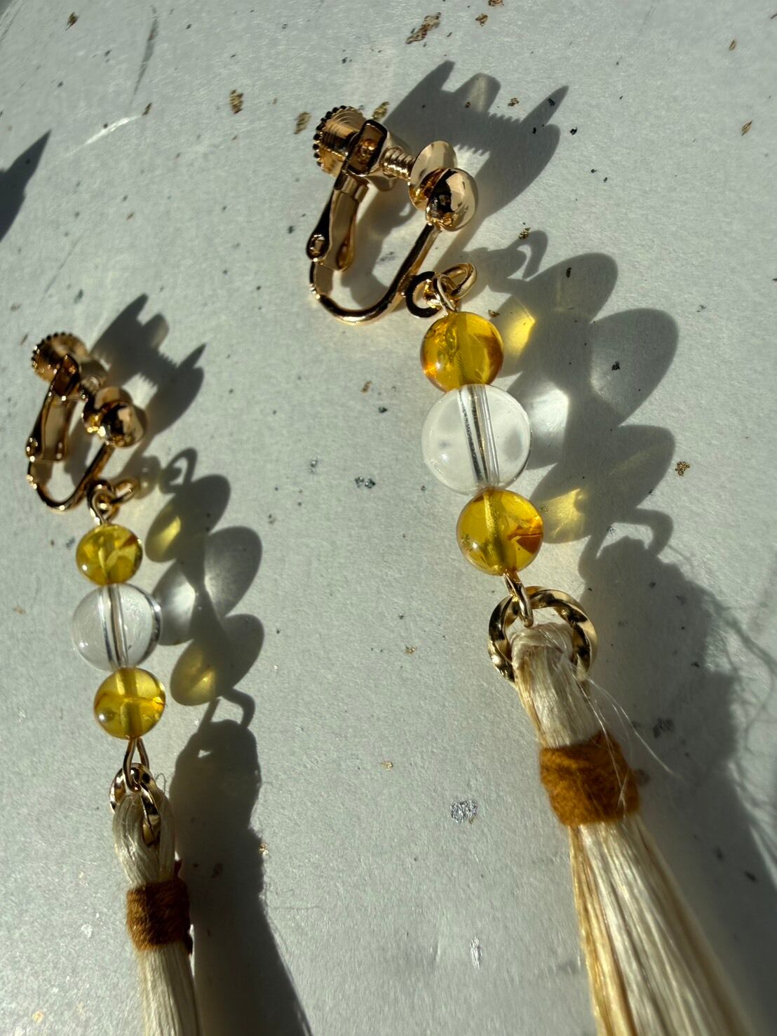 『琥珀の陽だまり』 バルチックアンバー(琥珀)×水晶×精麻タッセルのお守りイヤリング