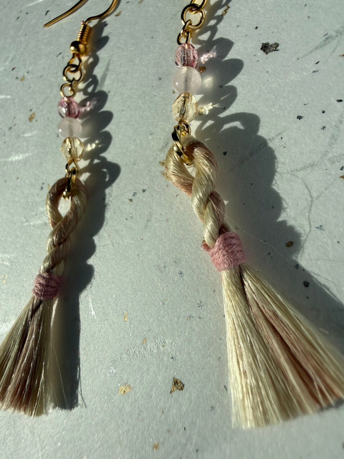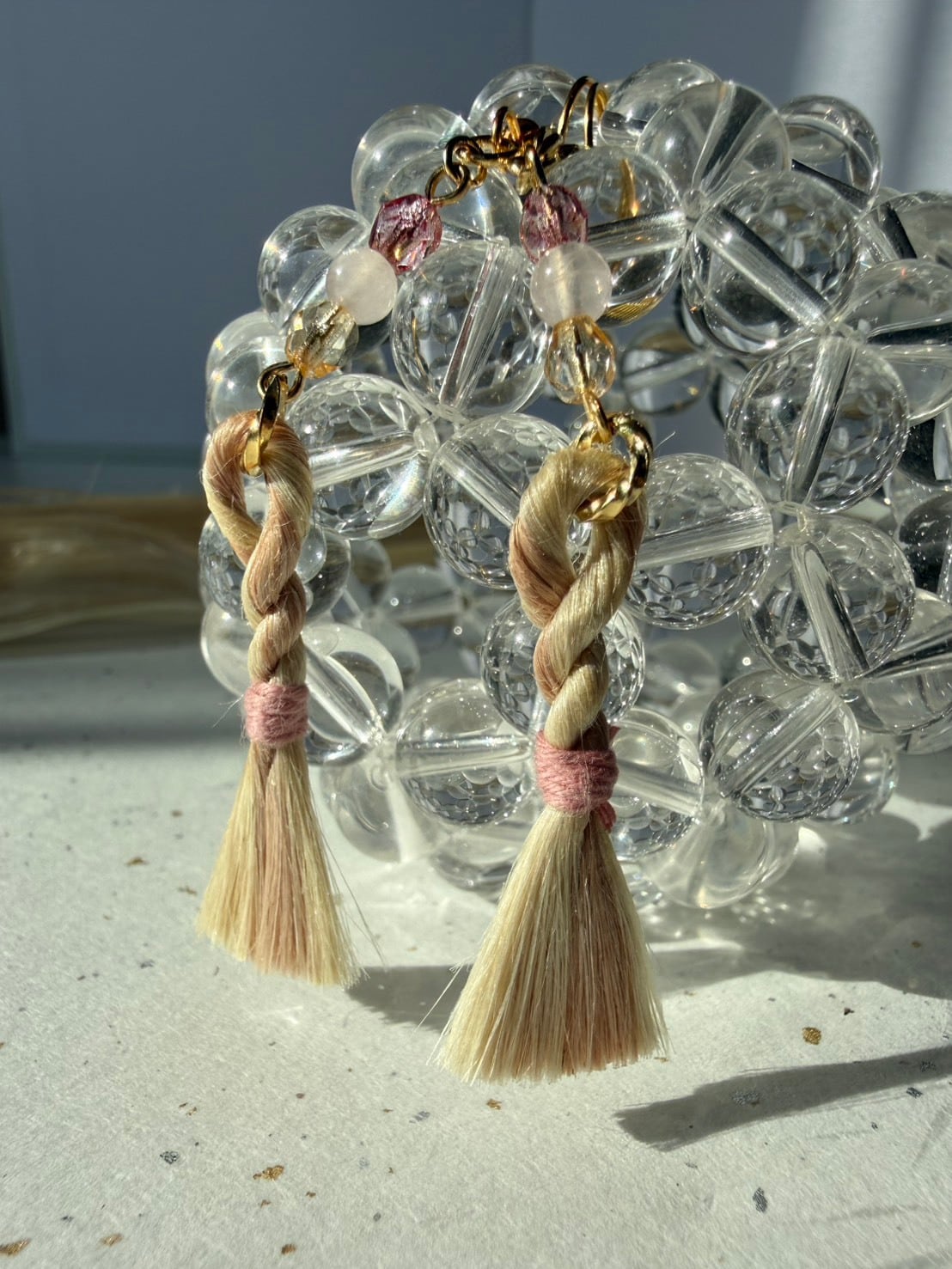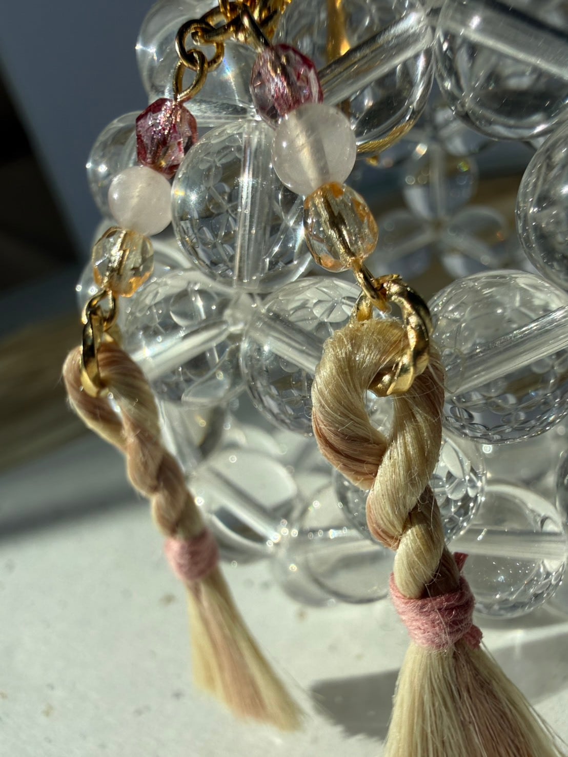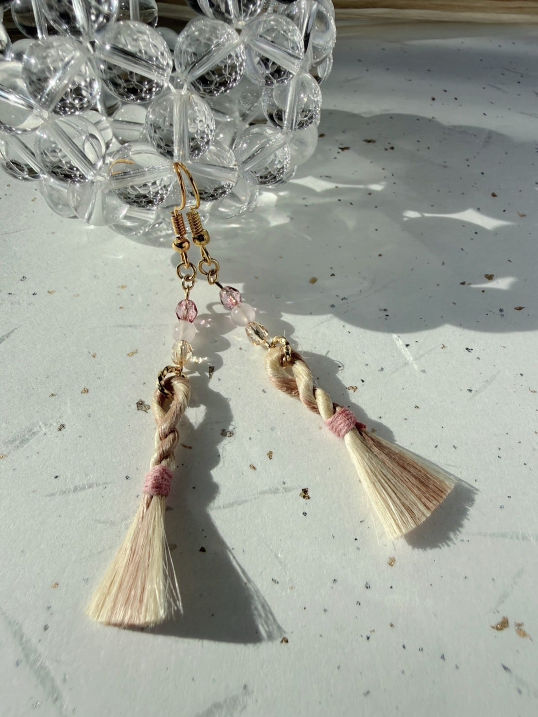 アクセントには、きらりと艶めくチェコビーズと、ミルキーでやさしいローズクォーツ。