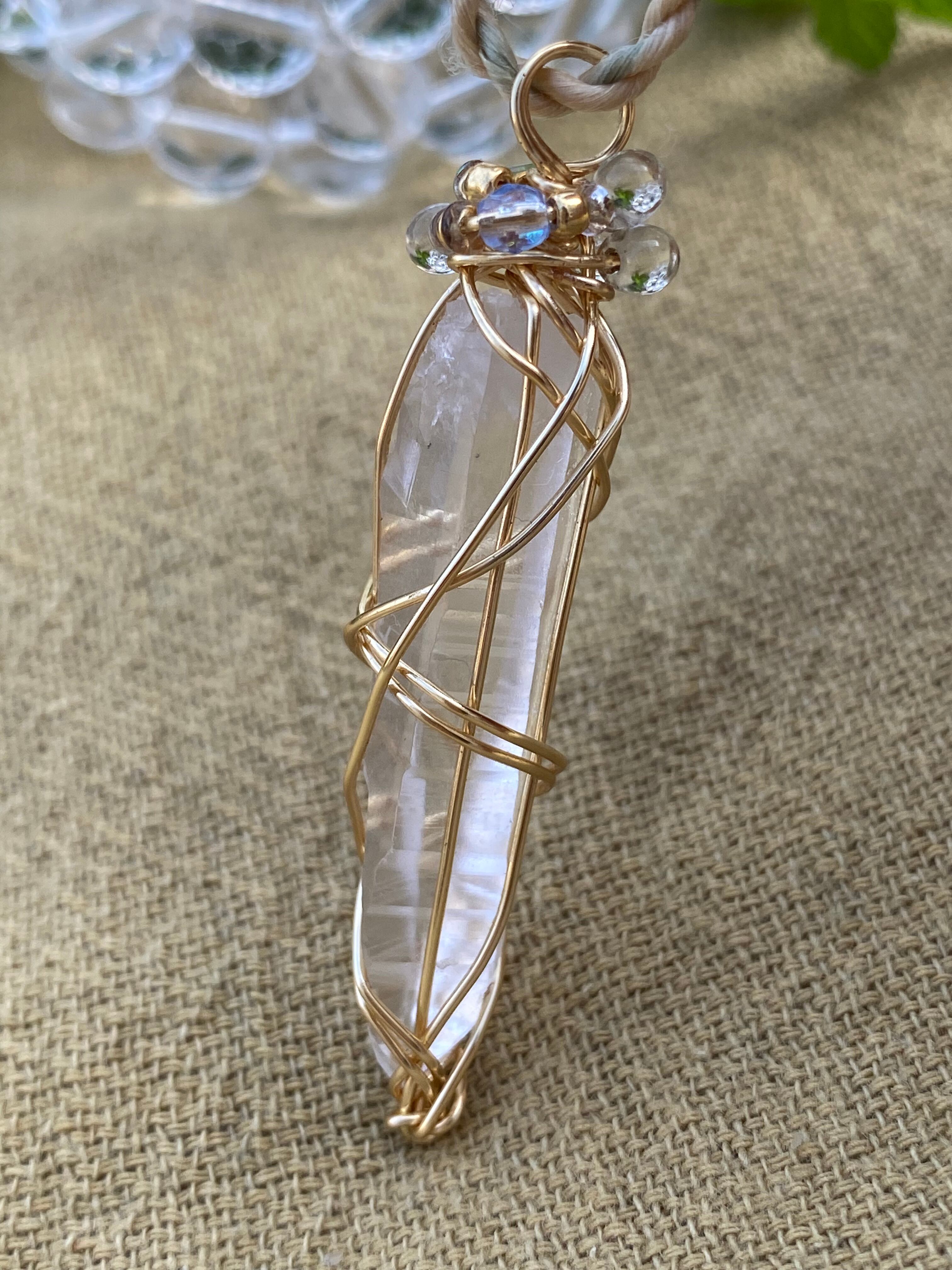 太古のレムリア時代の意志を継ぐクリスタルと言われる『レムリアンシード』聡明に煌めく天然の原石をジュエリーワイヤーを使いペンダントトップにしました。